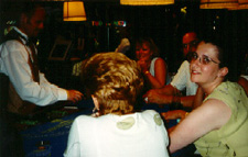 After that we made two more stops: the casino (where we blew another $3 apiece on the slots and said goodbye to Jeff, Julie, Wayne, and Jennifer), and the Rainbow Room, where the Caribbean band ("Voltz") was playing one last set, and Jessica actually had the Latin hip motion going out on the dance floor, and we said goodbye to Mary, Ida, Steve and Paul. Then we went home to be rocked to sleep for the last time... *sob*...