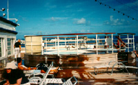At 4:15 we went to catch the fist few minutes of the Guest Talent Show, but we only saw the first act (a black lady from Queens doing a soulful contralto rendition of "Wind Beneath My Wings"); I would have been amused to watch the next guy sing "After The Lovin'," but we had to go because we wanted to be on time for the "Jewish Sabbath Service" being held at 4:30 (!) in the Scorpio Disco (!!). We got in there and a few of the entertainment staff were buzzing around trying to find us some wine; they pulled a bunch of kippot and some Gates of Prayer siddurim out from behind what looked like a bar, and told us that unfortunately there wasn't a rabbi on board but that we could pick someone from among us to lead it, and basically do whatever it is we do... I would have jumped up except that I've never used a Gates of Prayer (Reform) book; but there were several other adults in attendance, mostly one large extended Israeli family with about 10 kids running around, so I figured they'd have a better handle on it. Unfortunately what they did was to skip the actual service altogether and cut right to the dinner-table rituals: Kiddush and Motzi, with Shalom Aleichem and Eishes Chayil thrown in for good measure. But even that was more than we'd ever expected to see on board, and Shalom Aleichem is Jessica's favorite part of the service anyway; and needless to say, the food was the one angle they had seamlessly covered for us: challah and gefilte fish (!), and wine served in the same little metal stemmed cups they used at the formal dinners for our intermezzo sorbet (come to think of it, they had looked a lot like kiddush cups). So it was fine -- until one of the kids dropped a wine cup on the floor and nicely splattered both of our brand-new khaki shorts. Arrgh. So next we went down to the Rendez-Vous Bar and begged a little club soda to dab out our stains with. While we were sitting there, our dashing Slavic waiter Dragan came up behind us and joked, "Don't drink too much!" We finally got to ask him where he was from: Croatia, he said, Yugoslavia.